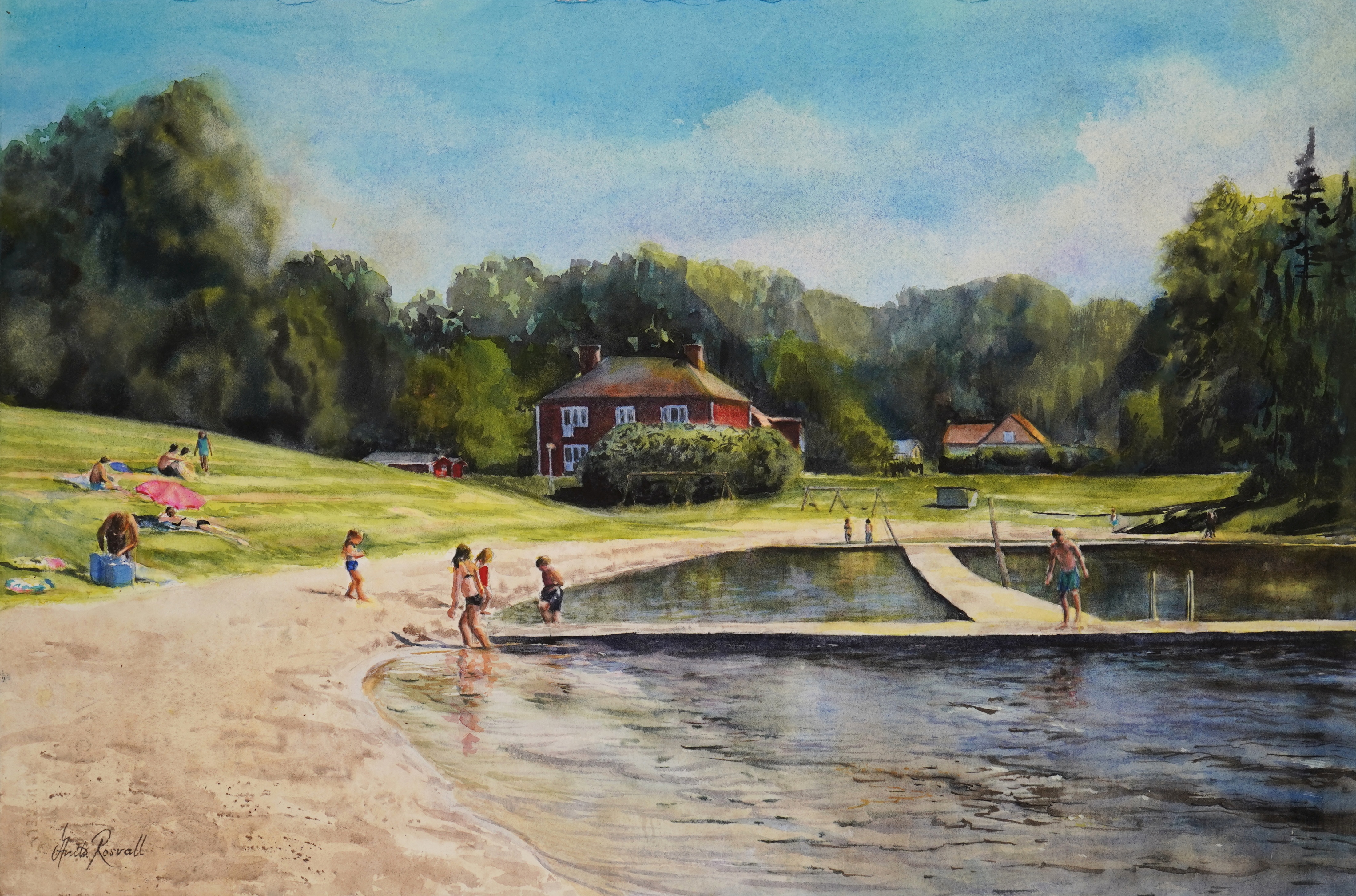 The sun's warm rays dance across the sand, children's laughter echoes in the air. A peaceful summer day fills the soul with joy and light, surrounded by nature's greenery.