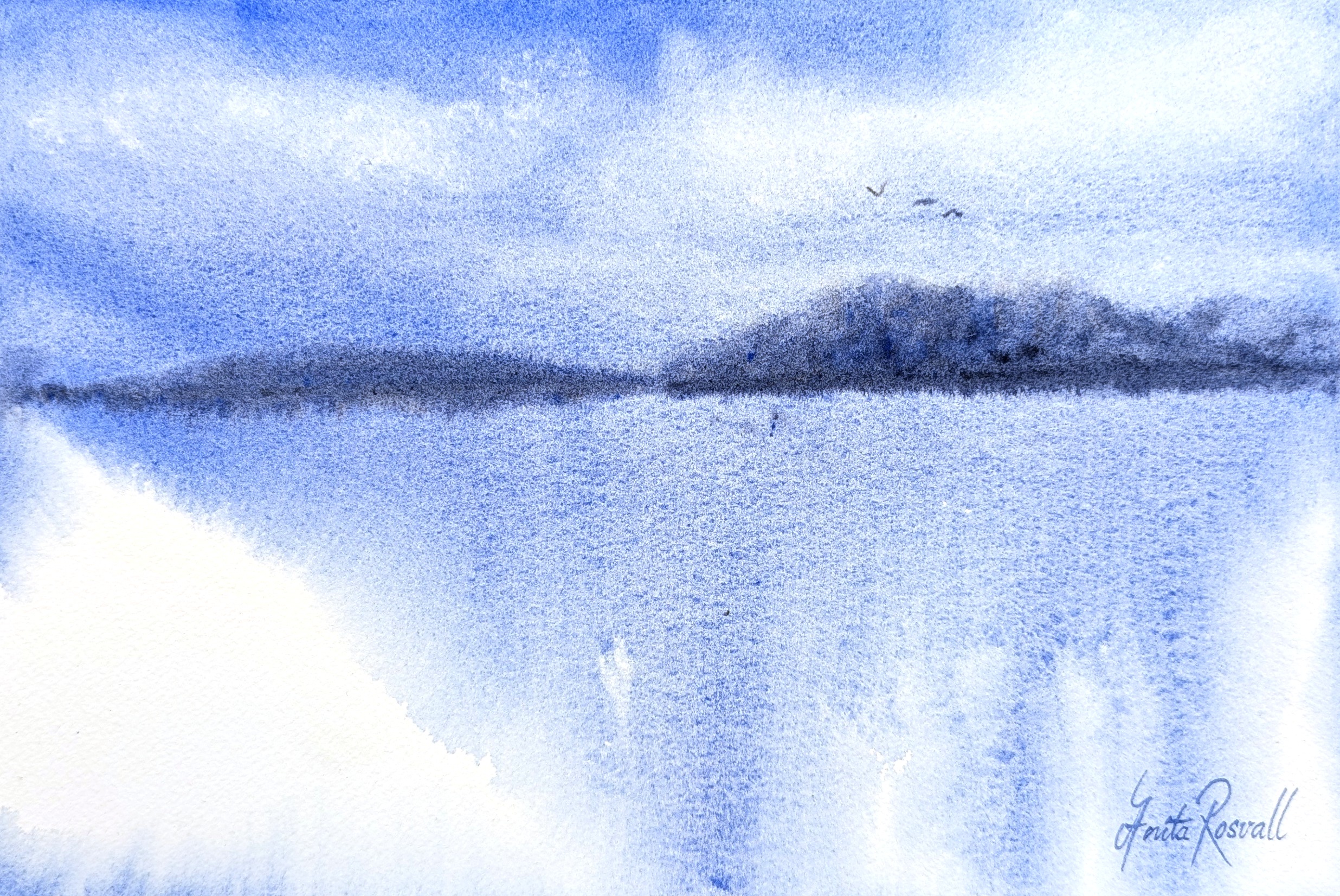 Kalla, blå vindar sveper över en stilla sjö, där horisonten andas av tystnad och fjärran drömmar i en förtrollande sommarkväll.