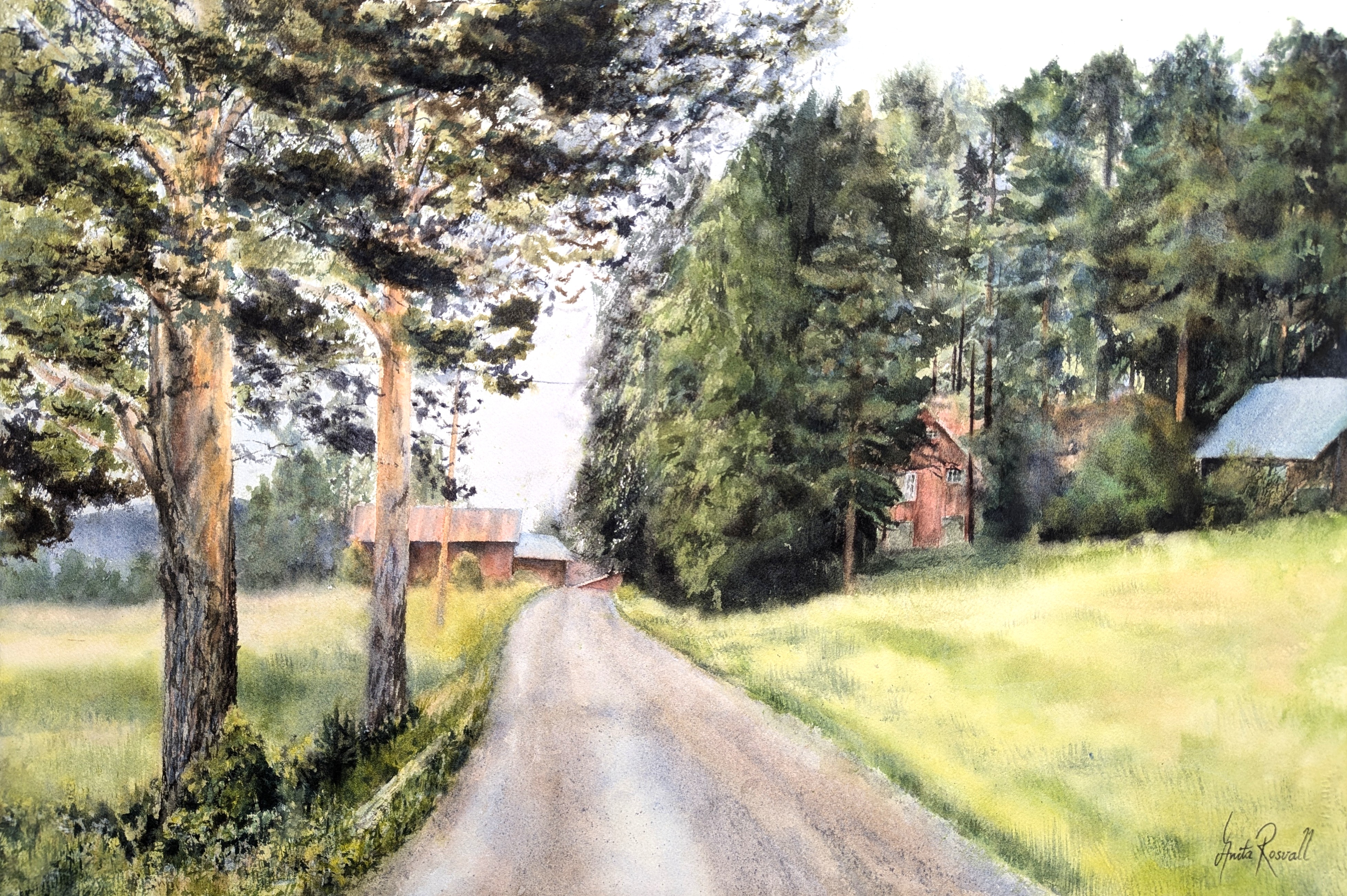 Upptäck en fridfull plats där grusvägen leder genom stora tallar och gröna ängar. Himlen är klar, och en stilla ro omsluter landskapet.