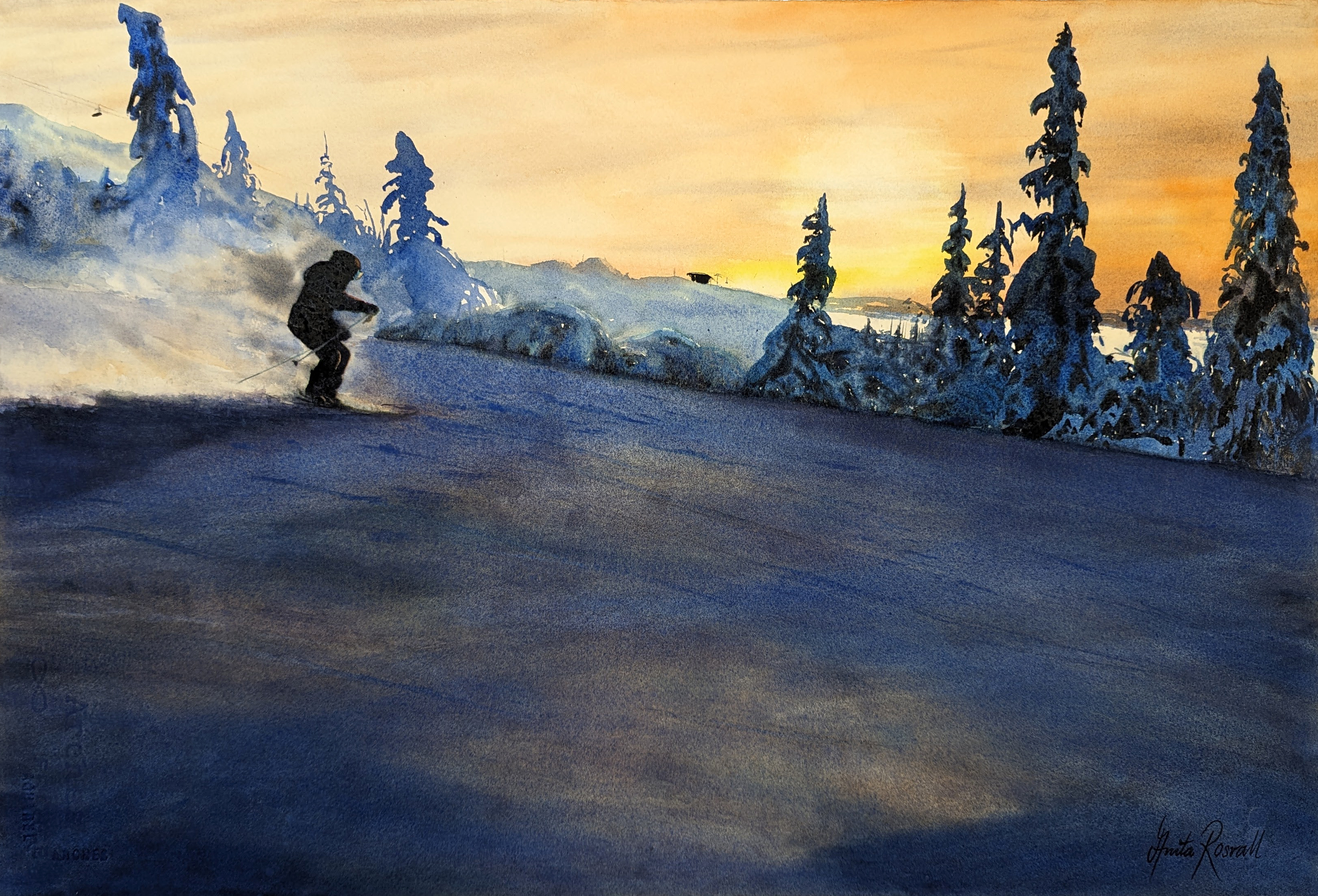 Vinterljuset silar genom trädens mörka siluetter, och snön glöder i motljus. En klar, lekfull rörelse anas i backens mjuka virvlar.