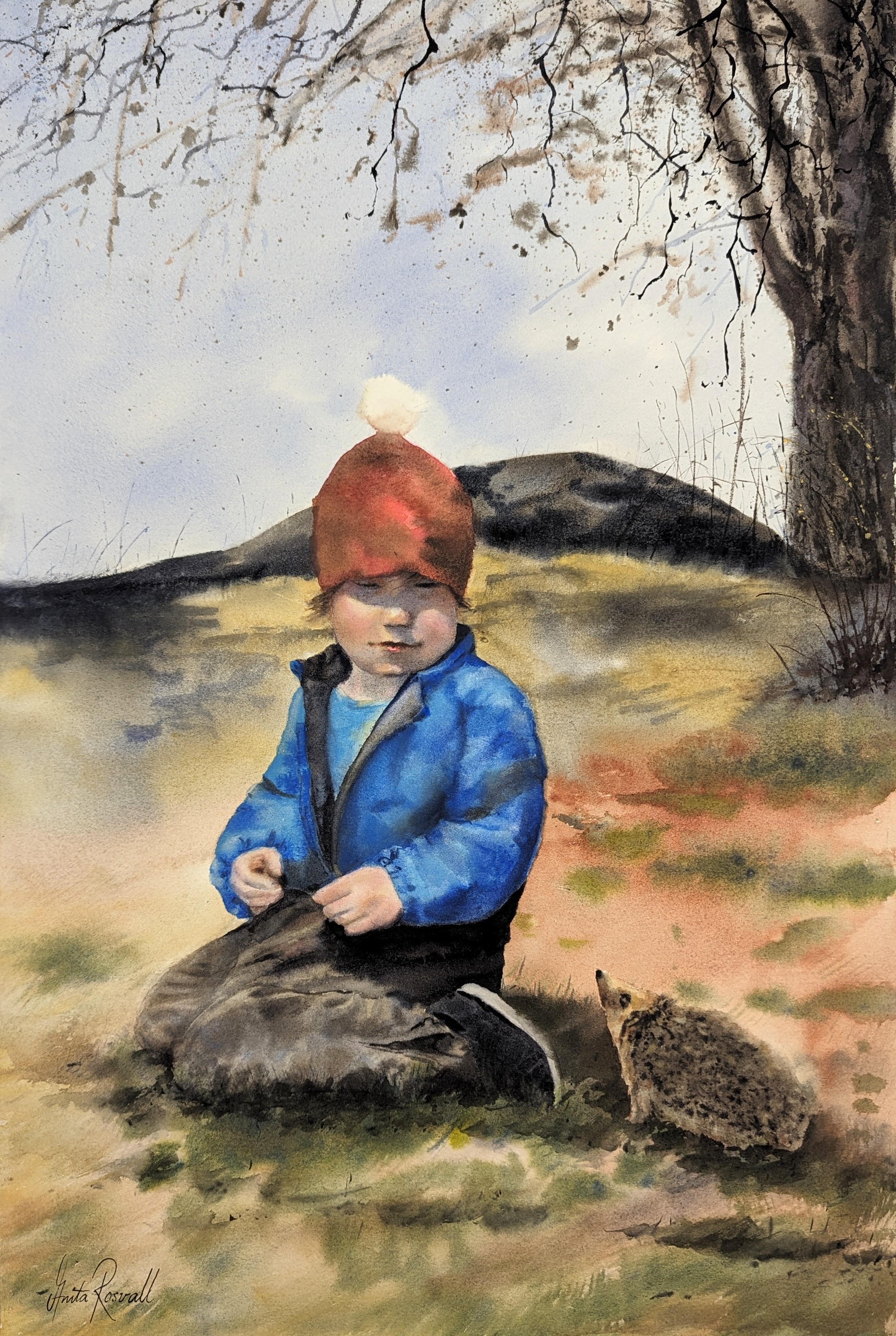 En vårbris smeker landskapet. Barnets nyfikenhet möter naturens tystnad. Ett ögonblick av stillsam förundran och försiktig vänskap spirar i det mjuka ljuset.